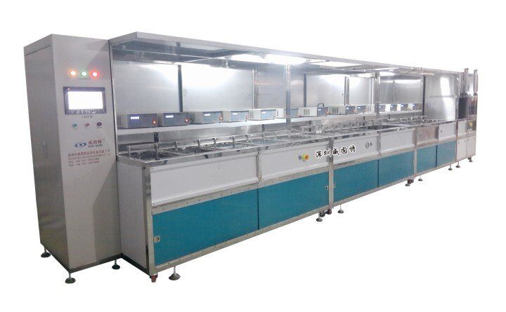 生化濾光片超聲波清洗機VGT-1609FP為生化濾光片超聲波清洗機,設備共有16個功能槽,配置有環保液處理系統、循環過濾系統、自動恒溫系統、拋動系統、超聲波清洗系統、抽風裝置、IPA漂洗系統、IPA烘干系統等。