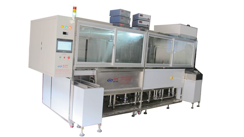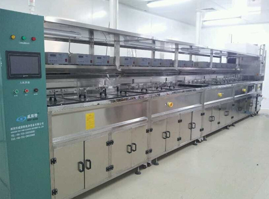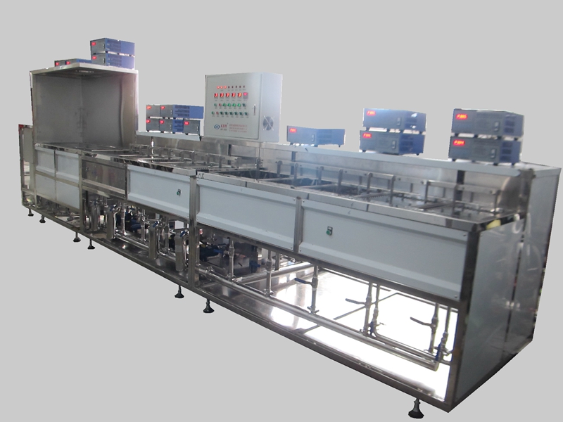 自動上料→1槽清洗劑超聲清洗28K→2槽清洗劑超聲清洗40K→3槽純水超聲漂洗28K→4槽純水超聲漂洗40K→5槽純水超聲漂洗40K→6槽熱風(fēng)烘干→自動下料。