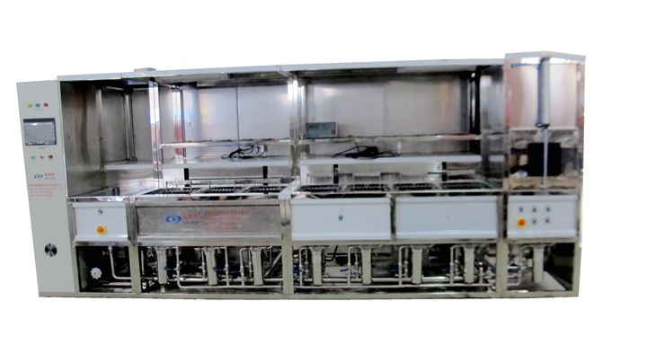 該超聲波清洗機主要由超聲波發生器、換能器、清洗槽、儲液槽、循環過濾系統、自動恒溫加熱系統、拋動系統、抽氣罩、冷水機、機架、電控柜等組成。